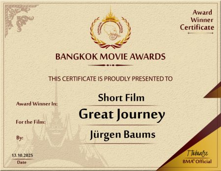 Jury comment: „We are thrilled to congratulate you on your remarkable success at the prestigious Bangkok Movie Awards. Your outstanding talent and dedication have been duly recognized in this acclaimed international film festival, where you have emerged as the shining victor. With this email, allow us to present you the E-Certificate and Laurel.“