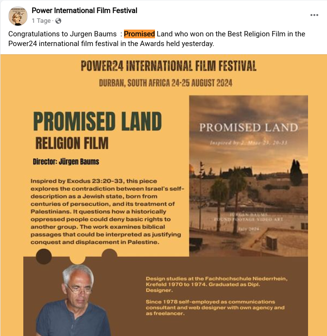 “Promised Land” ist Gewinner auf dem „Power24 International Film Festival“, Durban, South Africa“ in der Kategorie „Best Documentary Film“.