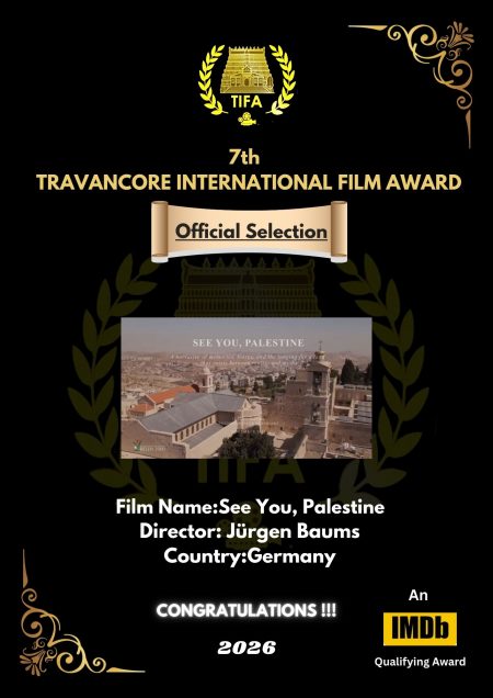 22. Januar 2026: Lieber Jürgen, herzlichen Glückwunsch! Die Travancore International Film Awards (TIFA) haben den Bewertungsstatus Ihrer Einreichung „See You, Palestine“ auf „Finalist“ aktualisiert.